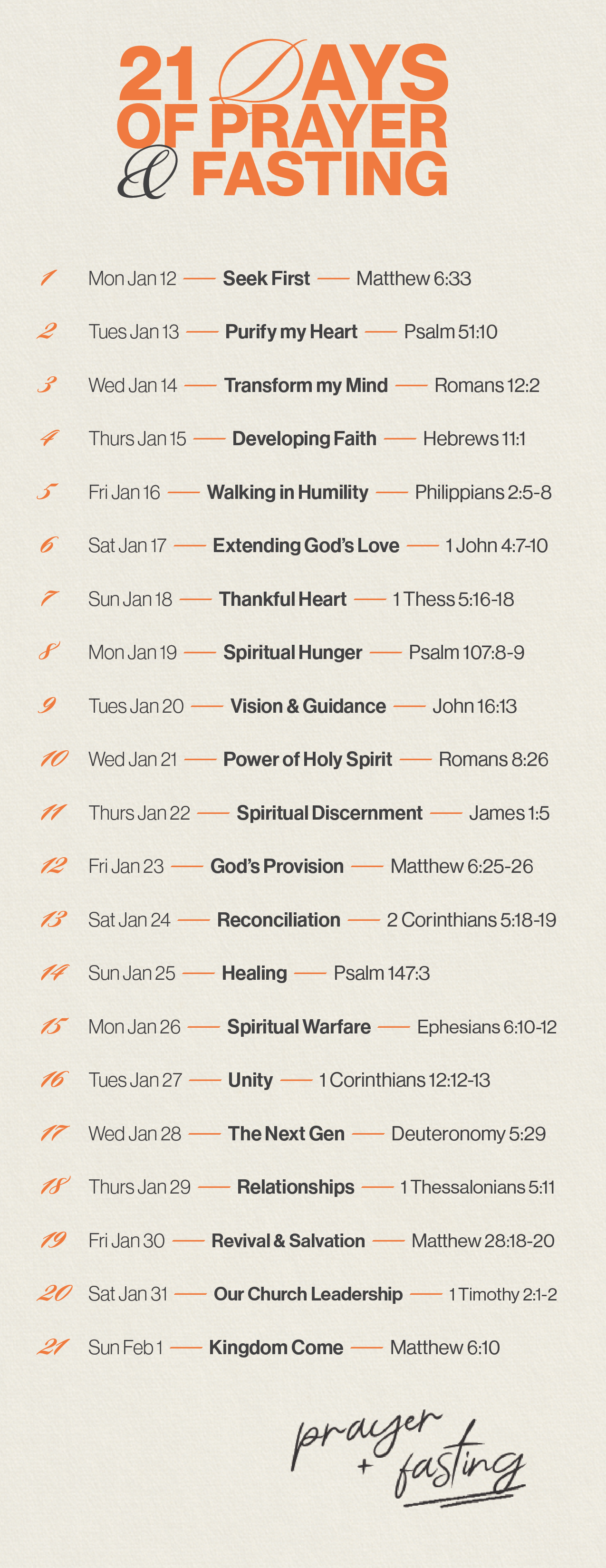 As a church family, we will begin 2026 with our annual rhythm of intentional prayer and fasting. We have found this to be a much-needed practice, as many of us are desperate for a breakthrough. This is something that the practice of fasting often brings forth. We are asking, “What is God waiting to pour out on our church, our city, or our lives if we would seek Him through prayer & fasting?”